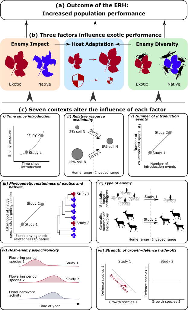 To address this, we have proposed a new framework for the ERH (Fig. 1), that has just been published in Ecology Letters. Our framework emphasises exotic performance as the key outcome of the ERH (Fig. 1a), with three factors – enemy impact, enemy diversity, and host adaptation – that influence performance (Fig. 1b). We then explore seven contexts that modulate the effect of these factors (Fig 1c): (i) time since introduction; (ii) resource availability; (iii) phylogenetic relatedness of exotic and native species; (iv) host–enemy asynchronicity; (v) number of introduction events; (vi) type of enemy; and (vii) the strength of growth–defence trade-offs.